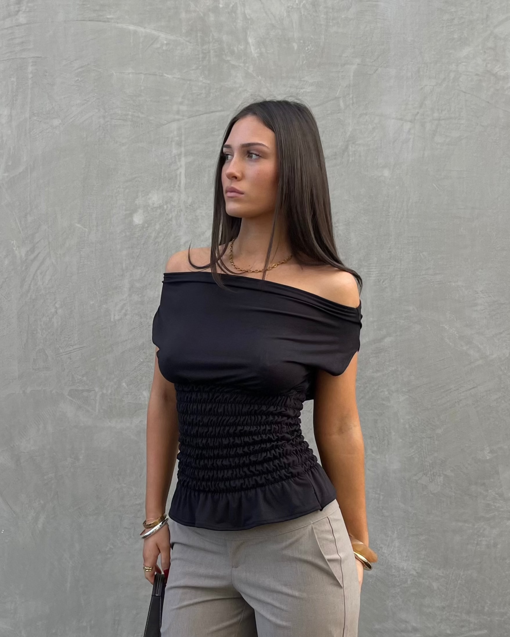 The Shirred Top is chic and modern, featuring an asymmetrical neckline and shirred detailing for added shape. Its the perfect statement piece to elevate any outfit. The Jersey fabric material of this top makes it both comfortable and stylish.